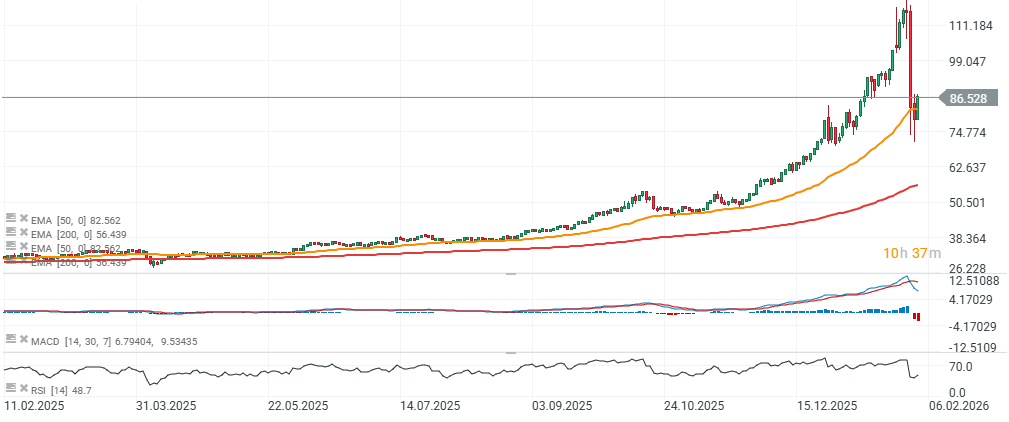 La plata también se ha recuperado tras caer por debajo de la EMA de 50 días (de magnitud similar a la de marzo de 2025). Sin embargo, el RSI aún no ha logrado superar los 50 tras la última caída pronunciada.