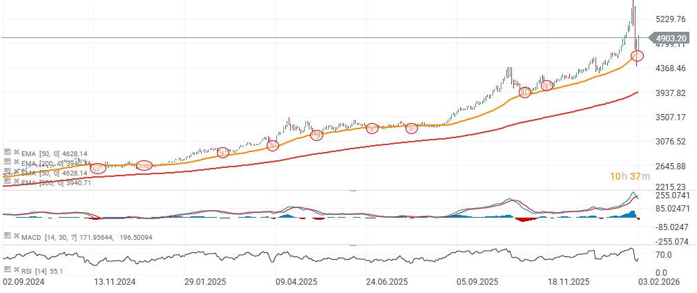 El oro repuntó rápidamente tras caer por debajo de la EMA de 50 días en el gráfico diario. Desde principios de 2025, la EMA de 50 días ha actuado repetidamente como un fuerte soporte de la tendencia.