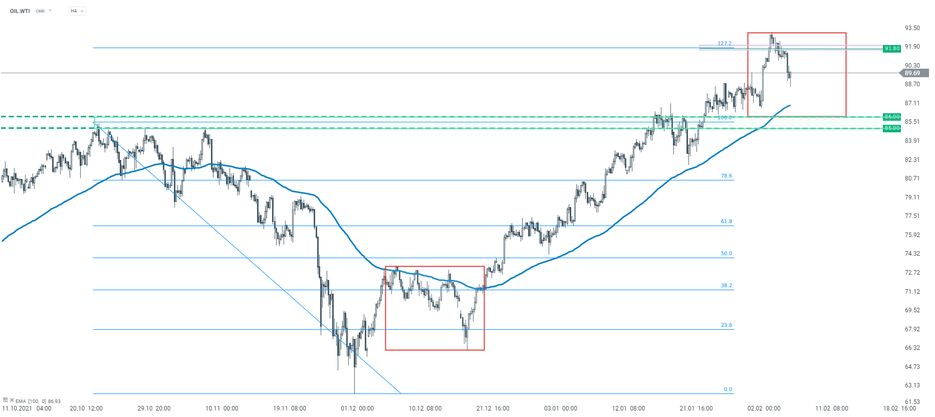 Si bien estos son desarrollos positivos para la economía global (y negativos para los precios), siguen siendo sólo comentarios, no acciones reales. El mercado del petróleo reaccionó en consecuencia con los precios del Brent y el WTI cayendo hoy más de un 2%. Echando un vistazo al gráfico OIL.WTI en el intervalo H4, podemos ver que el repunte de precios se detuvo después de alcanzar un retroceso exterior del 127,2% del movimiento a la baja de octubre a noviembre de 2021. El precio volvió a caer por debajo de 90$ por barril luego de la caída de hoy. El soporte técnico más cercano está marcado con EMA de 100 períodos (línea azul). Sin embargo, el soporte clave se puede encontrar más abajo y está marcado con el límite inferior de la geometría de mercado. Una ruptura por debajo de estos 86$ por barril podría ser seguida por un movimiento descendente más profundo.