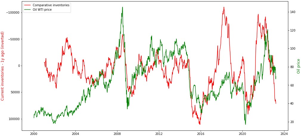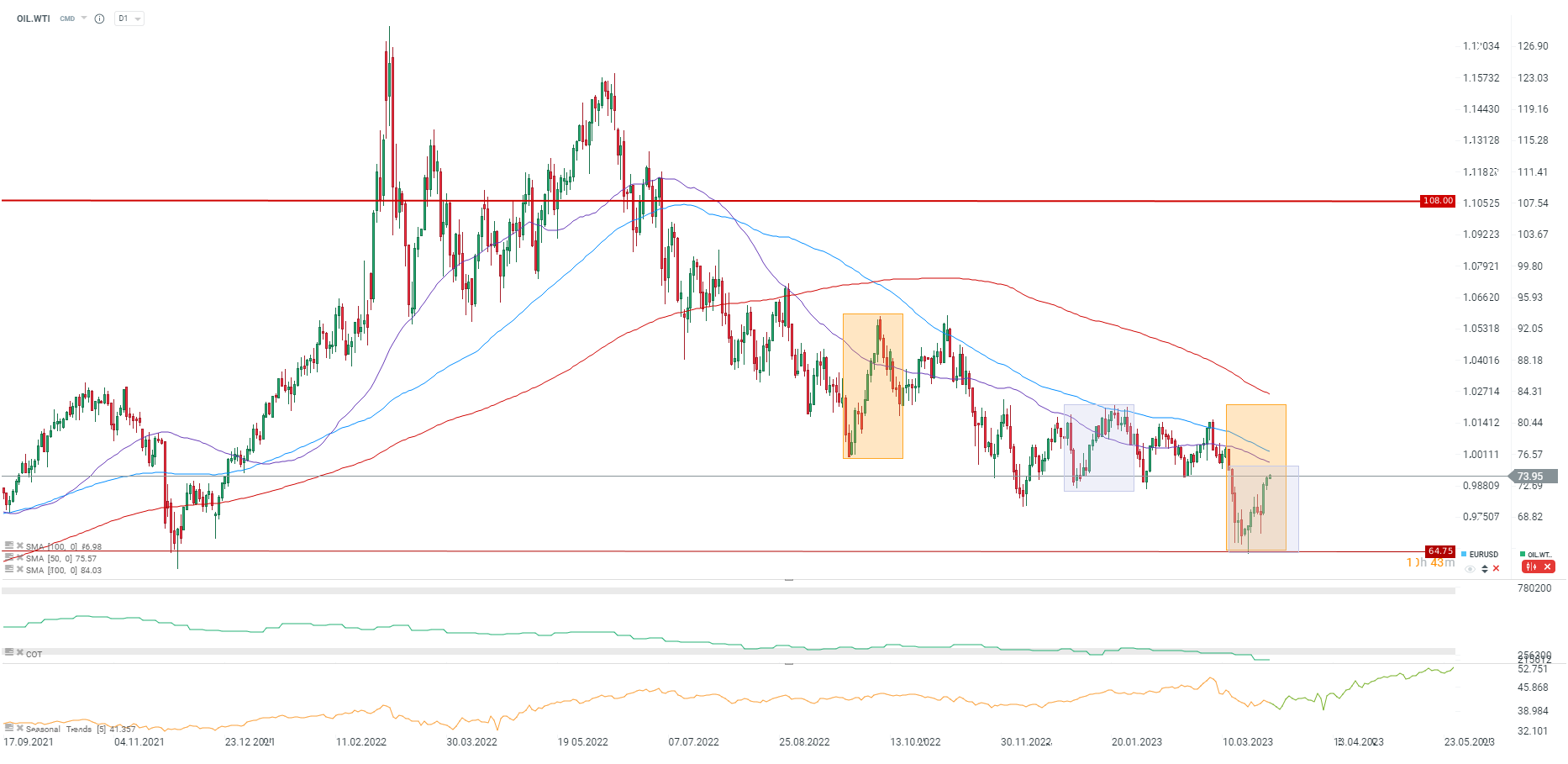 El petróleo ha recuperado gran parte de las pérdidas provocadas por la reciente crisis bancaria. Sin embargo, una mirada a los fundamentos sugiere que las caídas de precios pueden reanudarse y continuar. La oferta no cayó tanto como se temía ya que Rusia logró encontrar mercados para su petróleo. China sigue utilizando sus propias reservas y no aumenta las importaciones. Esto también puede conducir a una mayor acumulación en los inventarios de petróleo de EE. UU. Los inventarios comparativos (cambio nominal en el nivel de inventario durante 1 año) podrían ser un indicador importante aquí. Actualmente apunta a la posibilidad de nuevas caídas de precios y la señal de "fuertemente sobrevendido" no aparecerá hasta que los inventarios suban a 80-100 millones de barriles por encima de los niveles del año pasado. A menos que llegue una crisis económica, existe la posibilidad de que los precios se recuperen en la segunda mitad del año: los datos de las plataformas de perforación petrolera sugieren que la producción de EE. UU. está llegando a su punto máximo y que los inventarios en China se agotarán en algún momento.