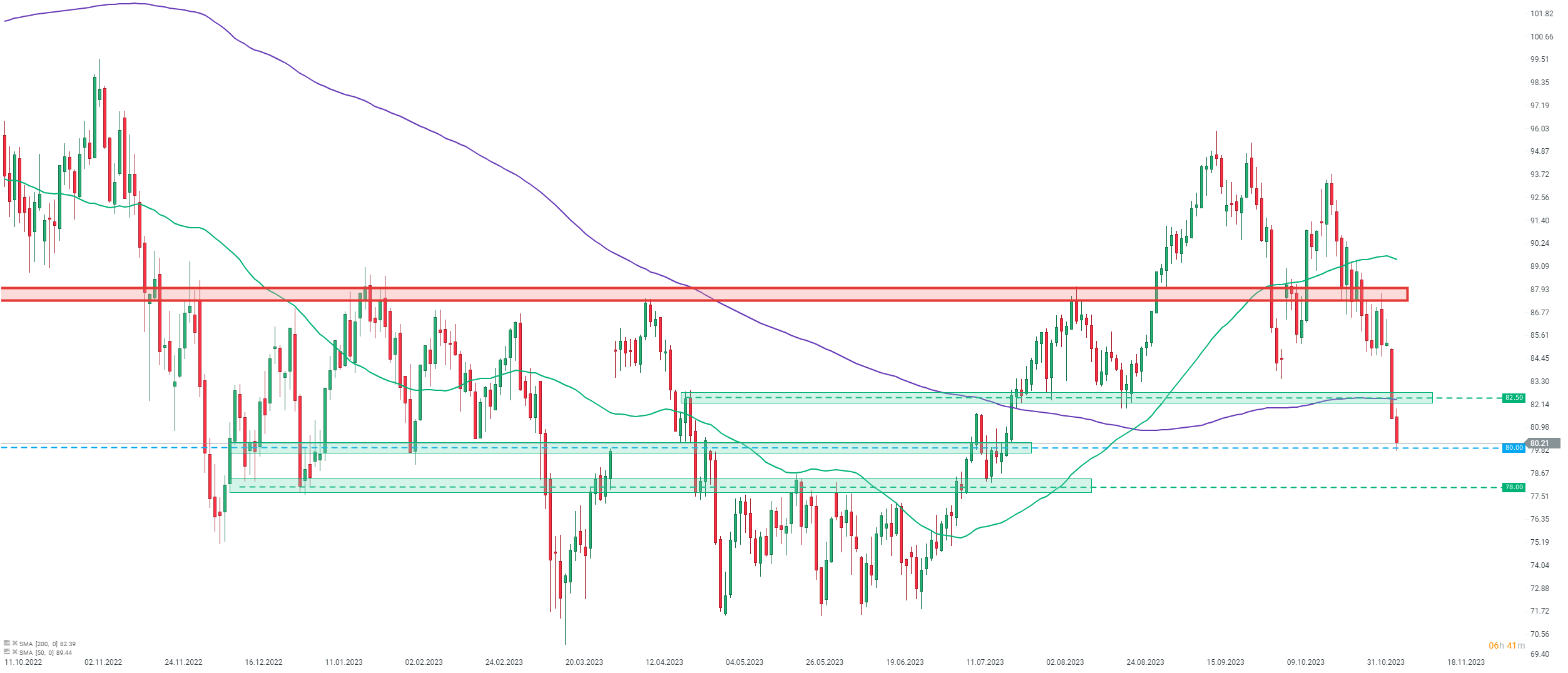 Si observamos el gráfico del Brent (PETROLEO) en el intervalo D1, podemos ver que el precio rompió ayer por debajo de la zona de soporte de $ 82,50, marcada por reacciones de precios anteriores, así como por el promedio móvil de 200 sesiones (línea morada). Las caídas se profundizaron hoy con el PETRÓLEO cayendo más del 1%. Esta tarde se realizó una prueba de la zona de 80 dólares por barril, pero los vendedores no lograron romper por debajo en el primer intento.