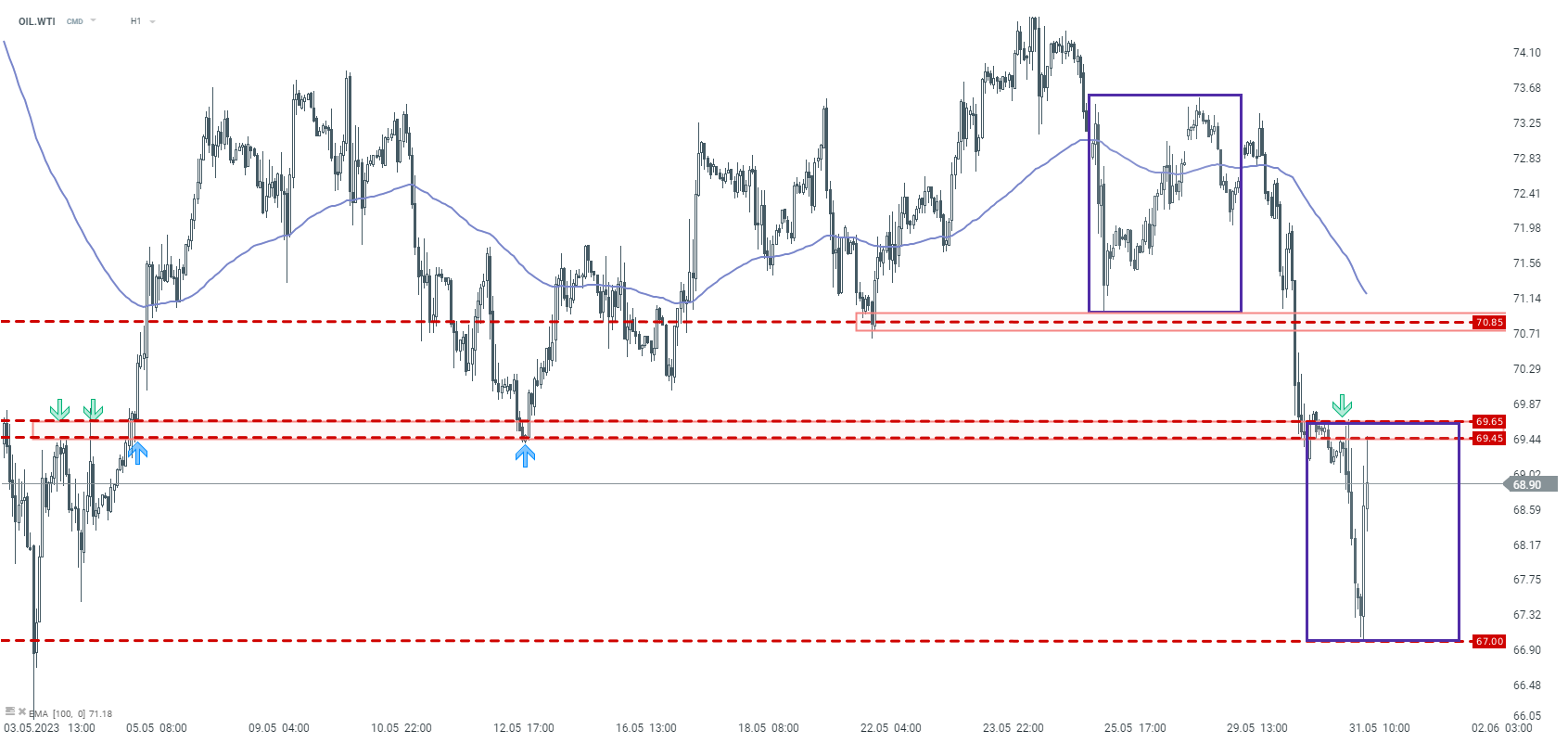 Echando un vistazo al gráfico del barril "West Texas" de referencia en EE.UU. (OIL.WTI) en el intervalo H1, podemos ver que el precio se desplomó al área de 67$ el día de hoy, donde se encuentran los mínimos de principios de mayo. Sin embargo, los alcistas tomaron el control después y se lanzó un fuerte movimiento alcista. Si bien el OIL.WTI todavía cotiza alrededor de un 1% más bajo en el día, ha estado cayendo hasta un 4% antes. Sin embargo, la continuación del movimiento alcista dependerá de si los compradores logran empujar el precio por encima del área de 69,45$-69,65$, donde se puede encontrar el límite superior de la geometría del mercado local.