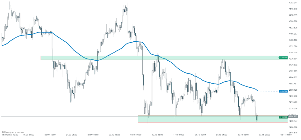 Al analizar el gráfico de Ethereum desde una perspectiva técnica diaria, es probable que estemos presenciando un cambio en el sentimiento del mercado. El precio subió significativamente entre abril y agosto de este año, mientras que en septiembre y octubre se observó un claro retroceso, que provocó una caída por debajo de los 4.000 dólares. Actualmente, el precio de Ethereum se encuentra por debajo de la media móvil de 100 períodos, marcada con una línea verde en el gráfico inferior. El precio también se mantiene por debajo de la zona clave de 4.200 dólares - 4.000 dólares, lo que, según la metodología de Overbalance, podría indicar una posible reversión de la tendencia o el inicio de una corrección mayor. Si se confirma este escenario, el precio podría dirigirse hacia el soporte de 3.400 dólares, donde se encuentra el mínimo de agosto, o, si lo rompe definitivamente, incluso hacia la zona de 2.800 dólares - 2.865 dólares, donde se han producido reacciones de precio significativas anteriormente. Por otro lado, un retorno del precio por encima del nivel de 4.200 dólares podría llevar a la reanudación de la tendencia alcista. En ese caso, también sería posible que el precio de Ethereum experimente un movimiento hacia los máximos recientes en la zona de los 4.800 dólares.