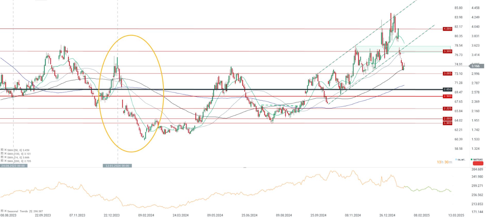 El año pasado, la corrección que comenzó en enero resultó en una corrección de más del 50% en el precio del gas. Actualmente, la corrección es de menos del 30%. Una corrección de alrededor del 40% significaría una caída potencial a 2,5/$MMBTU, mientras que una del 50% significaría una caída a 2,2$/MMBTU. La estacionalidad supone mayores caídas, al menos hasta principios de febrero. Fuente: xStation5