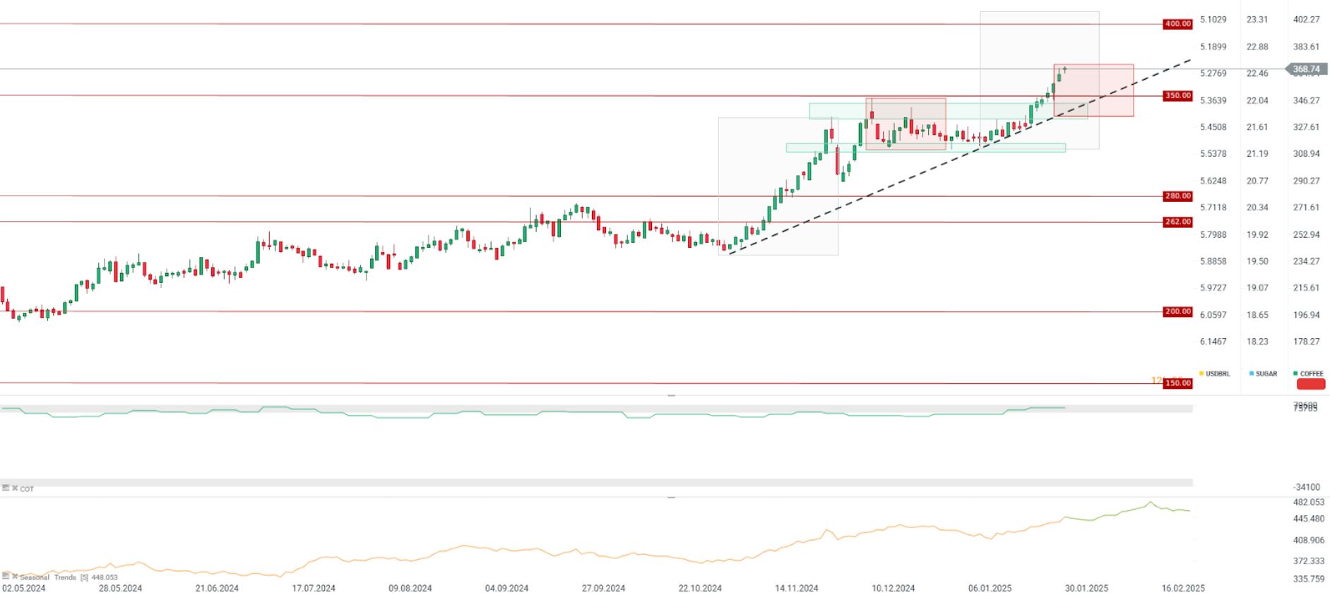 El café sigue subiendo y alcanza nuevos máximos históricos. Ante la falta de perspectivas de mejora, no se puede descartar un ataque al nivel de los 400 centavos por libra en los próximos meses. Al mismo tiempo, los soportes clave para el café son la línea de tendencia alcista y la zona entre los 330 y 350 centavos por libra. Fuente: xStation5