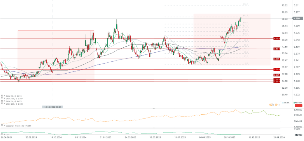 El precio se encuentra actualmente en el nivel de 5$/MMBTU, que coincide con el retroceso de Fibonacci del 161,8% de la última gran onda bajista. El precio se sustenta en la media móvil de 14 períodos, que actúa como un soporte crucial a corto plazo. Cabe destacar que el patrón actual de aumentos es muy similar al del año pasado, aunque el consumo actual es mayor que en el mismo período del año anterior. La magnitud del aumento sugiere que podría alcanzarse un máximo en la segunda quincena de enero. Sin embargo, si el consumo de gas aumenta aún más en enero o febrero, el precio podría estabilizarse significativamente por encima del nivel actual y repetir la situación de 2022, aunque probablemente de forma limitada.