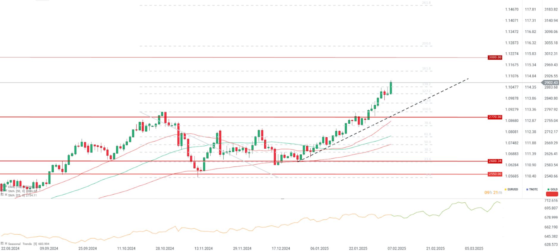 El precio del oro ha superado niveles clave y se encuentra a menos de un 3,5 % de los 3.000 dólares. Al mismo tiempo, el oro se está alejando de la línea de tendencia alcista, lo que significa una clara aceleración del impulso alcista. La última vez que se produjo una corrección importante fue en la primera parte de diciembre. Fuente: xStation5