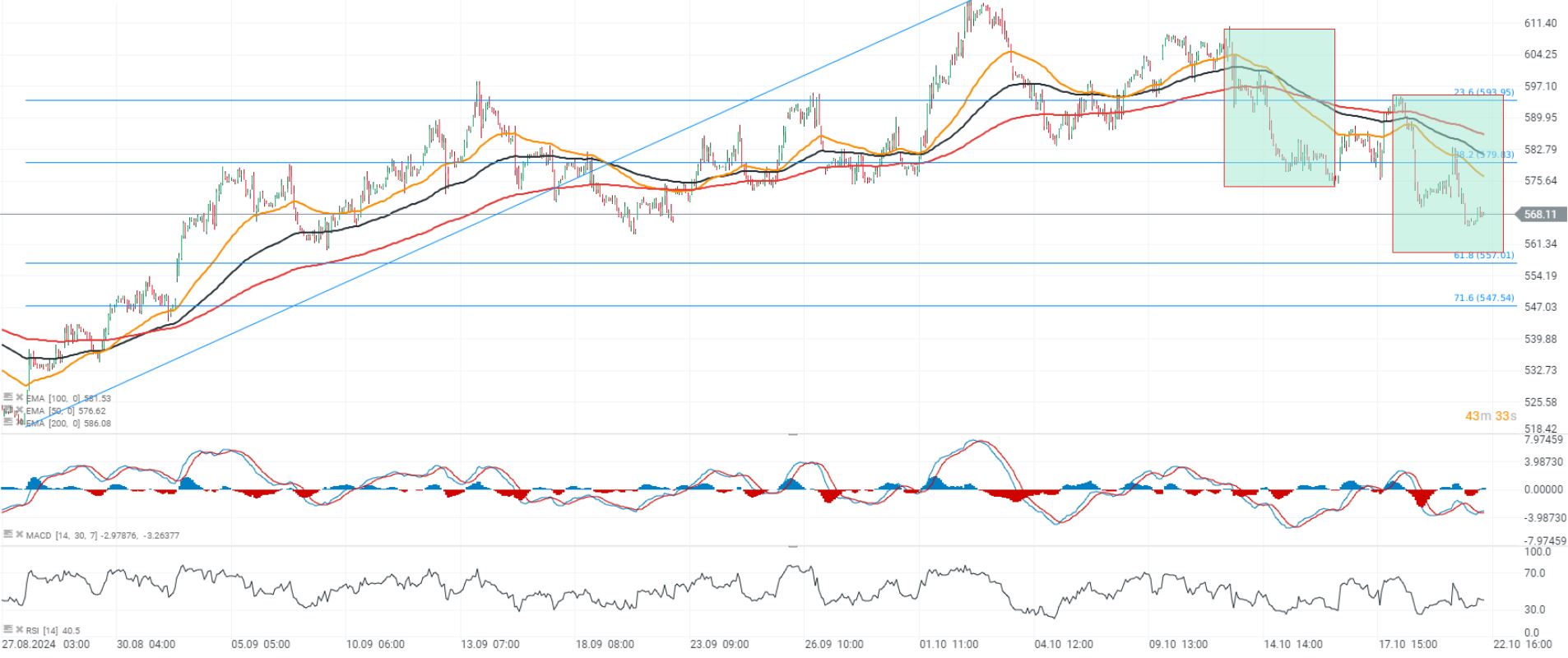 Si observamos el gráfico del precio del trigo en el intervalo H1, vemos que los precios se han asentado nuevamente por debajo de tres medias móviles clave, lo que indica un sobrecalentamiento de la tendencia alcista y una posible prueba de la zona en torno a la eliminación de Fibonacci de 61,8 de la onda ascendente iniciada después del último desplome. El mercado no ha aceptado niveles superiores a 611 dólares.