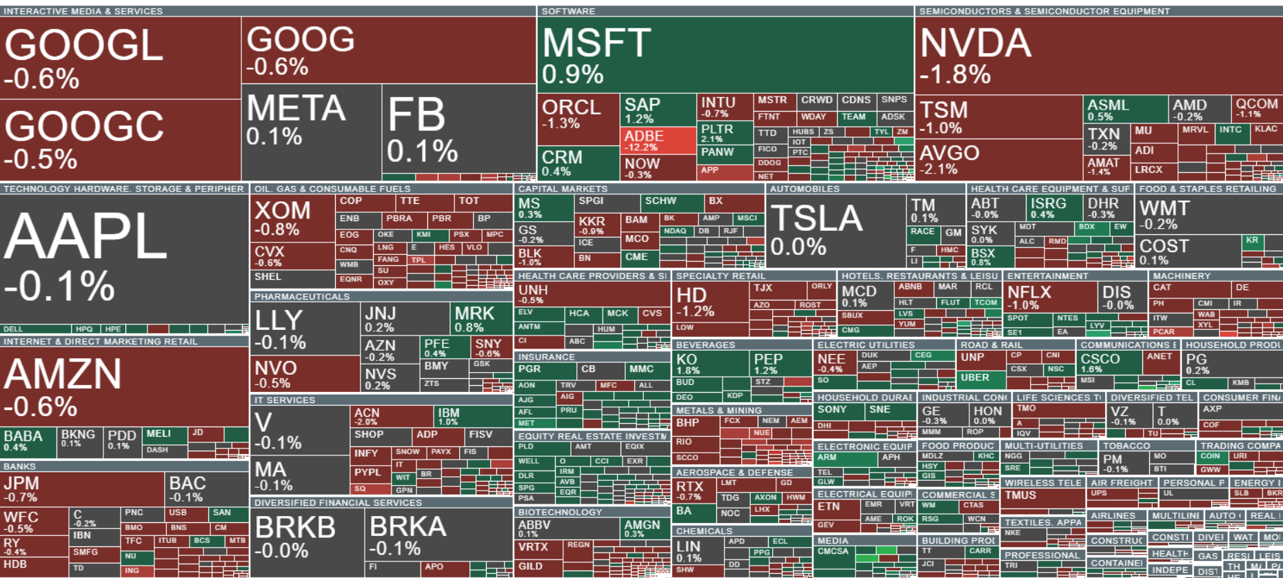 El mapa de calor de empresas del S&P 500 es en su mayor medida rojo en la sesión de hoy, lo que indica el panorama negativo con el que ha comenzado la sesión.