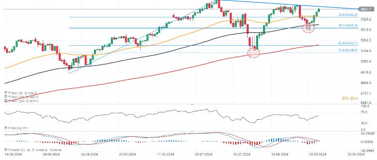 El índice SP500 cotiza hoy con un alza de casi el 0,6%, pero el índice puede enfrentarse a una seria prueba de demanda cerca de los 5660 puntos. Las caídas se defendieron en agosto en el nivel EMA200 (línea roja) y recientemente la demanda reaccionó para probar el EMA 100 (línea negra), dibujando una formación (potencialmente) alcista de mínimos cada vez más altos.