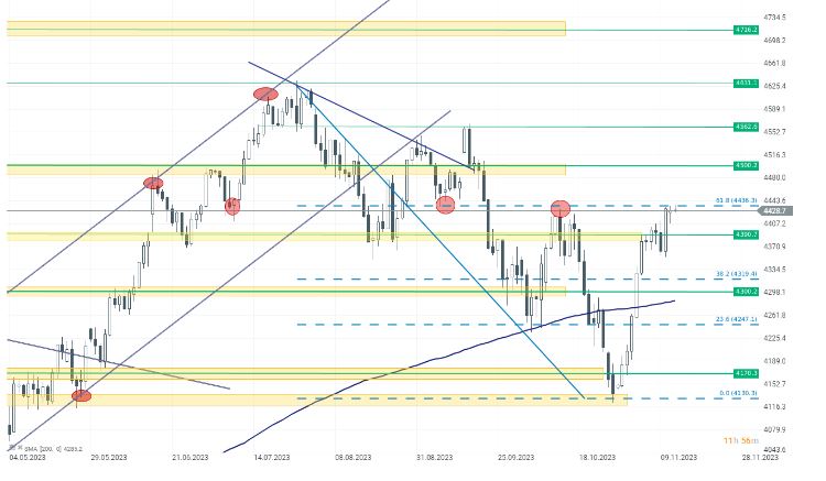 Wall Street sube ligeramente antes de la apertura de la sesión de contado, concretamente entre un 0,05% y un 0,20%. Para el SP500, la sesión de hoy y el informe de inflación de octubre pueden ser cruciales para la continuación de la tendencia. Actualmente, los alcistas están luchando contra la resistencia en el nivel de 4430 puntos, que coincide con el retroceso de Fibonacci del 61,8% de la última onda bajista. Si se confirma la caída de los precios, los inversores pueden intentar superar el precio por encima de esta zona de resistencia, entonces el camino hacia el nivel 4500 permanecerá abierto. De lo contrario, hay que tener cuidado con los niveles de 4370-4400 puntos, ya que pueden ser importantes para mantener la tendencia alcista después del último rebote a finales de octubre.