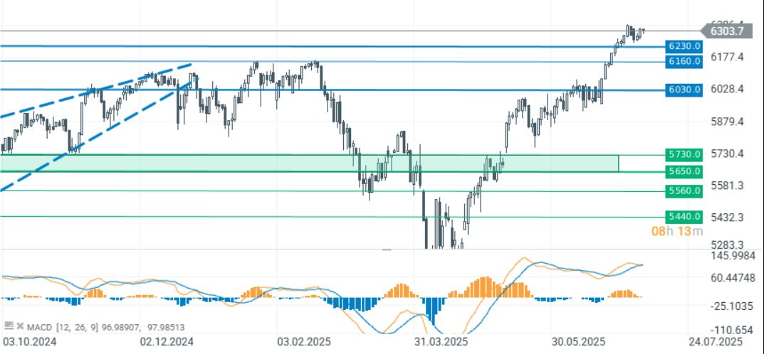 El índice cotiza hoy en torno a los 6300 puntos, justo por debajo de los máximos históricos alcanzados el 3 de julio. La consolidación en estos niveles podría ser una señal positiva para los alcistas. Sin embargo, es probable que un mayor impulso alcista requiera un catalizador importante, como avances en las negociaciones comerciales o sólidos informes de resultados trimestrales. Se espera que ambos factores se aclaren en las próximas dos semanas.