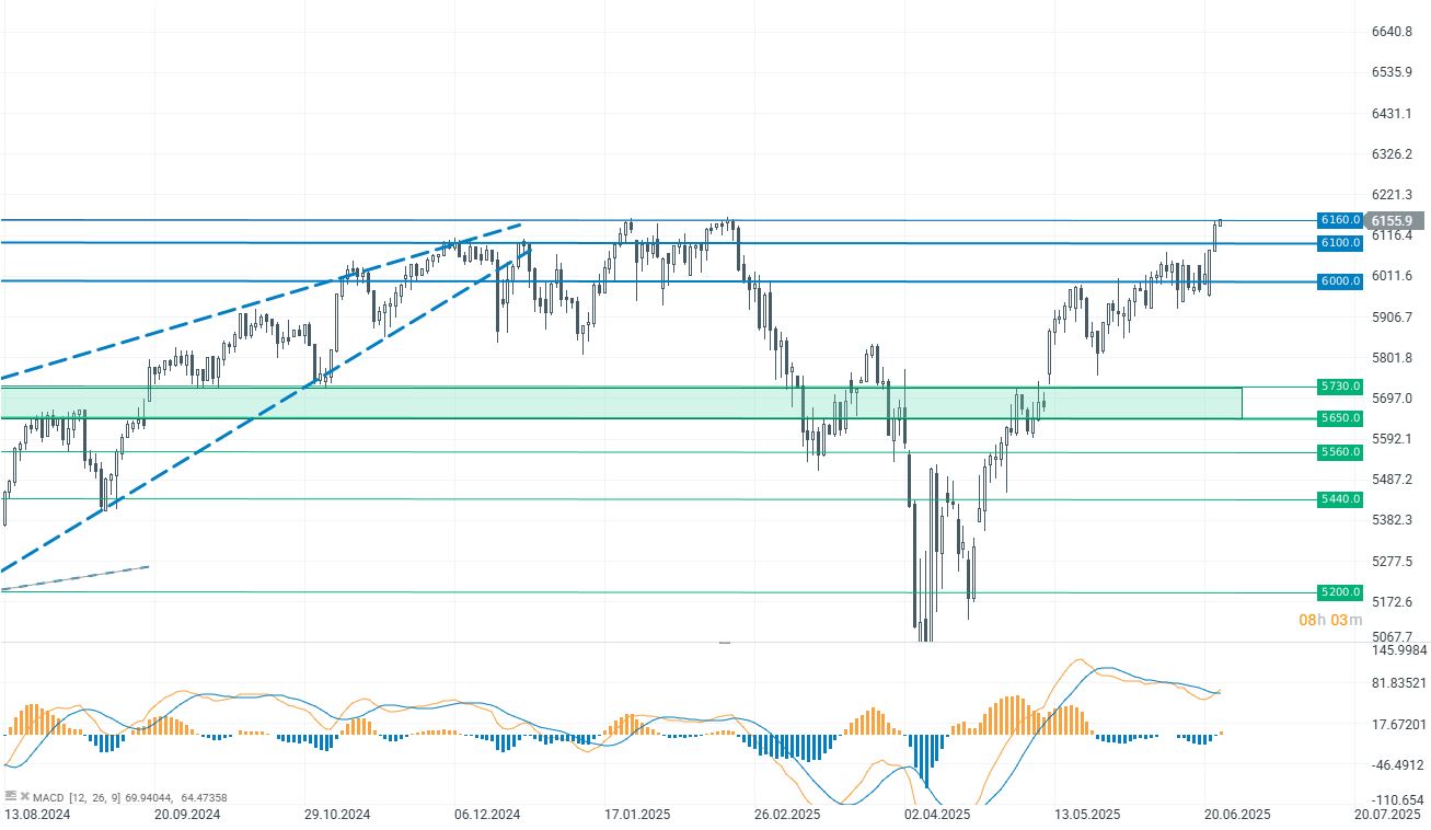 El S&P 500 está alcanzando hoy máximos históricos en torno a los 6160 puntos. Tan solo en las últimas tres sesiones desde la desescalada del conflicto en Oriente Medio, el índice ha ganado un total del 3,26 %.