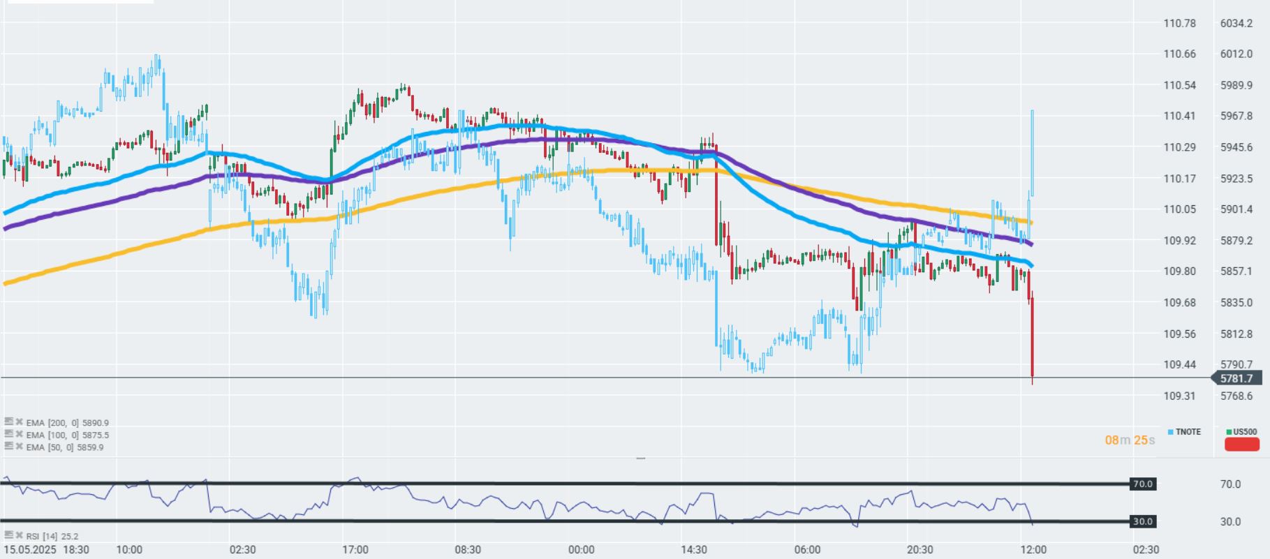 TNOTE sube con fuerza tras el anuncio de Trump, mientras que el contrato US500 pierde un 1,3% en pocos minutos. Fuente: xStation