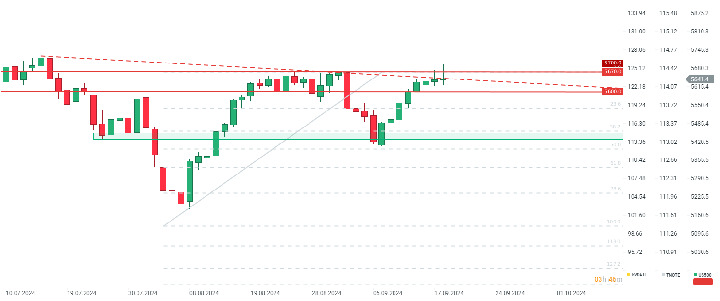 El S&P 500 subía momentáneamente hasta los 5.670 puntos tras la decisión de la Fed, poniendo a prueba los picos locales de ayer y los niveles de principios de septiembre. Después, las subidas se han moderado un poco en previsión de la conferencia de Powell a las 20:30. Por el momento, la decisión es recibida positivamente en el mercado, dada la perspectiva económica estable y la voluntad de hacer fuertes recortes, lo que significa una victoria contra la inflación y la voluntad de luchar por un mercado laboral más fuerte. Si Powell consolida la expectativa del mercado de una economía fuerte y la necesidad de recortes debido al fin de la lucha contra la inflación, el S&P 500 podría dirigirse hacia el nivel de los 5.700 puntos.