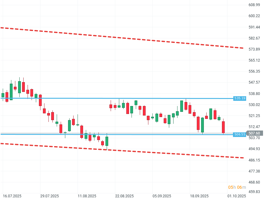 El precio está cayendo hacia los mínimos registrados en la segunda mitad de agosto. Se está moviendo dentro de un estrecho canal de consolidación entre los 535 y 506. Nuevas caídas podrían indicar un intento de probar el límite inferior de la tendencia bajista de largo plazo.