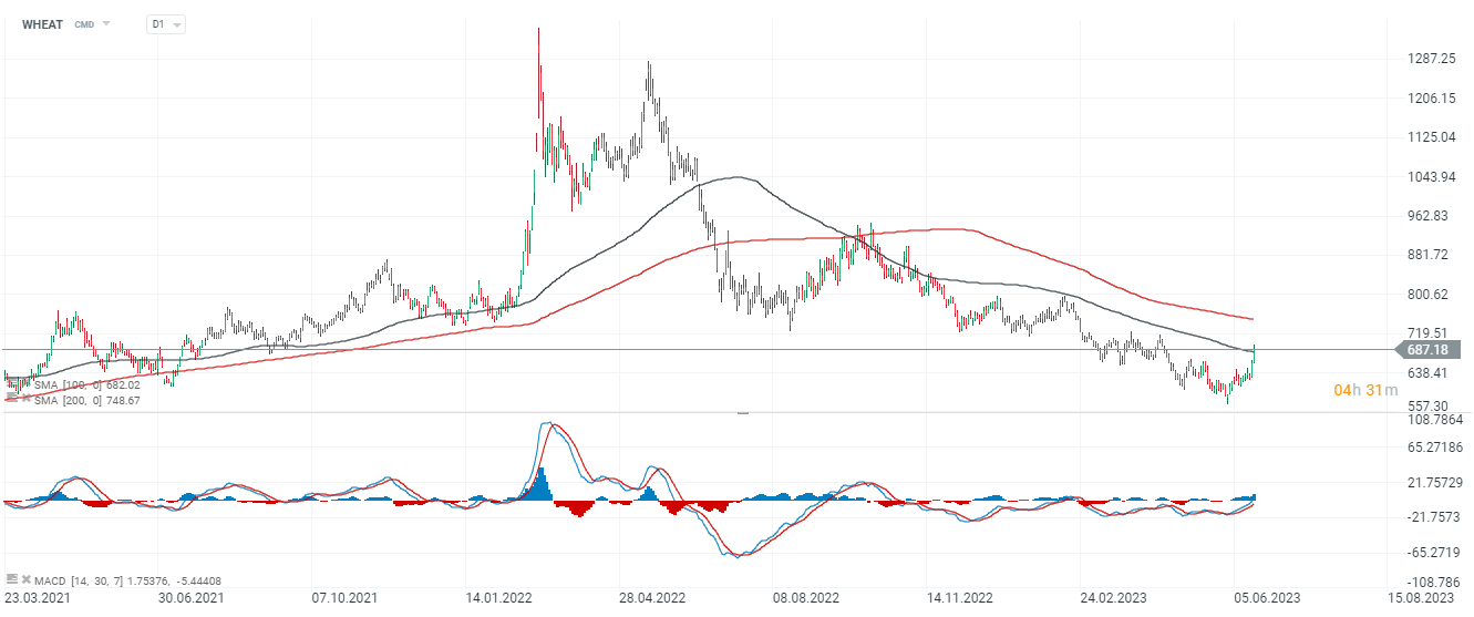 Gráfico del trigo (WHEAT), intervalo D1. El precio de los contratos de trigo rompió la SMA de 100 en $682, pero vale la pena señalar que la tendencia bajista ha durado mucho tiempo y todavía es el escenario base desde el punto de vista del análisis técnico hasta que se supere la resistencia clave en $750, donde encontramos la SMA de 200 (línea roja). Fuente: xStation5.