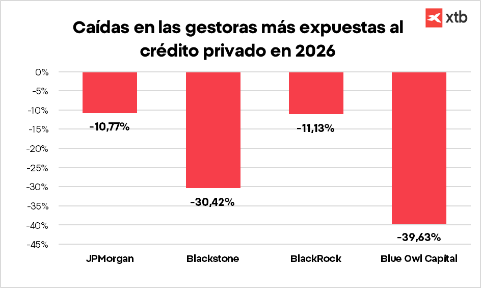 Blue Owl Capital, con una caída cercana al 40%, y Blackstone, con descensos de alrededor del 30%, lideran las pérdidas. Cuando el mercado teme impagos o reembolsos masivos estas firmas son las primeras en sufrir porque su modelo está casi totalmente ligado a ese negocio.