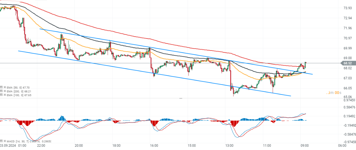 Los precios del petróleo siguen subiendo hoy, ya que el dólar estadounidense se vio respaldado por los datos del IPC de ayer y por la suspensión de una parte importante de la capacidad de producción en el Golfo de México después de que el huracán Francine azotara la costa de Luisiana esta noche. Alrededor del 39% de la capacidad de producción estadounidense en el Golfo de México se detuvo debido a eso. Los temores sobre la producción de petróleo estadounidense pueden respaldar el aumento del precio del WTI hasta la zona de los 70 dólares, donde podemos ver una fuerte zona de resistencia. Por otro lado, para inicIar un repunte, el petróleo necesitaría datos económicos muy sólidos, especialmente de China y de los EE. UU. Por ahora, la tendencia principal sigue siendo a la baja.