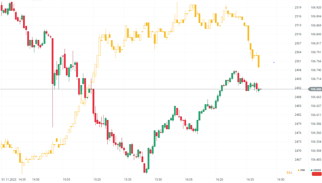 Los aumentos en los precios de los futuros del zinc se aceleraron hoy en un momento en que vimos caídas más fuertes en el índice del dólar estadounidense. El dólar está hoy bajo presión por la caída de los rendimientos de los bonos del Tesoro estadounidense a 10 años. Fuente: xStation5