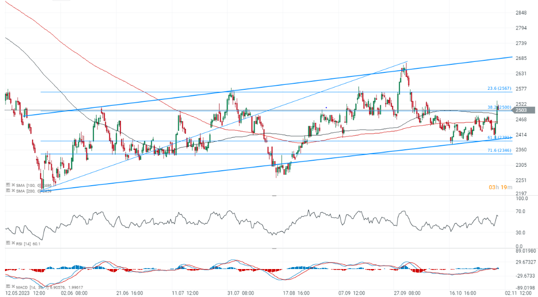 Los precios del contrato de zinc lograron hoy superar el retroceso de 38,2 de la onda ascendente de mayo de 2023 y actualmente todavía están luchando por mantenerse por encima del importante soporte cercano a los 2.500 dólares. Potencialmente, una nueva caída por debajo de $ 2,400 podría significar que se materialice un escenario bajista de ruptura del patrón de bandera bajista. Fuente: xStation5
