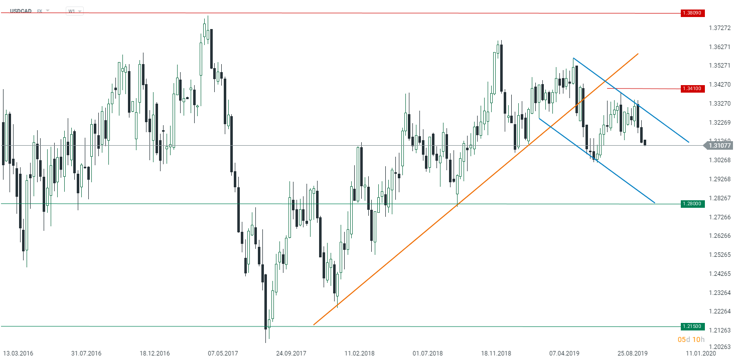 Después de romper por debajo de la tendencia alcista, el USDCAD no ha podido volver por encima. Técnicamente vemos que el par se dirige hacia abajo después de rebotar en el límite superior del canal bajista. El primer soporte importante se puede encontrar cerca del límite inferior de esta estructura. Fuente: xStation5