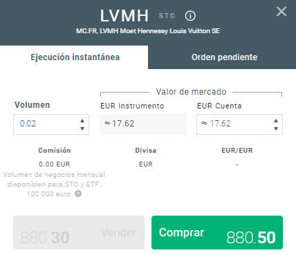 Las Acciones Fraccionadas nos permiten comprar la cantidad que deseemos desde los 10 euros por acción. Por lo tanto, podríamos comprar 100 euros en Louis Vuitton y ser propietarios con los mismos derechos de la parte proporcional de esa acción. Es tan fácil como escribir los decimales en la orden o detallar directamente la cantidad exacta que queremos invertir.