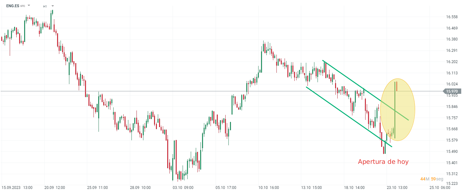 El inicio de sesión tras la presentación de los resultados ha sido muy positivo y la compañía ha llegado a liderar en el arranque de sesión en el Ibex 35. La ruptura al alza del canal bajista dibujado nos permite ser positivos en el corto plazo en su cotización principalmnete si consigue romper por encima de niveles de resistencia en 16 euros por acción,