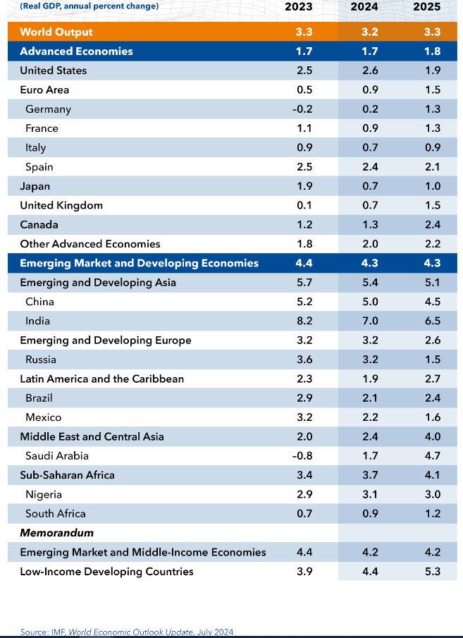 El FMI ha publicado hoy sus estimaciones de crecimiento entre las principales economías del mundo. En esta ocasión ha dejado sin cambios las estimaciones de este año con un crecimiento del 3,2% mientras que incluso ha aumentado su estimación del 2025 hasta el 3,3%.