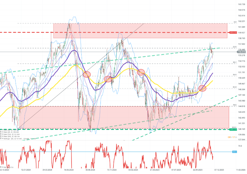 La diferencia de tipos de interés entre EE. UU. y Japón es del 3,5%, lo que facilita las ganancias del "carry trade", pero ejerce una presión continua sobre el yen, que ya ha perdido la mitad de su valor desde 2020. Un escenario crítico para Japón supone superar los 160 yenes por dólar debido a los drásticos aumentos en los precios de los combustibles y los alimentos.