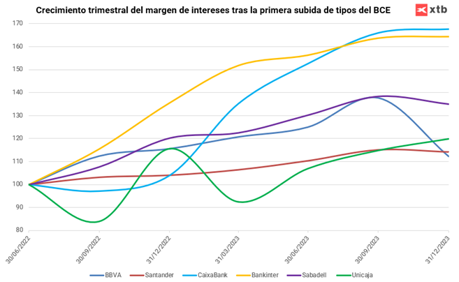 Si analizamos por entidades, el comportamiento ha sido similar pero podemos encontrar algunas excepciones. Este es el caso de Unicaja, que pese a que su crecimiento a lo largo del año ha sido peor que el del resto de compañías, en el último trimestre del 2023 consiguió un crecimiento intertrimestral del 4%. Esto contrasta con las caídas de BBVA, Santander o Sabadell y de un comportamiento plano por parte de CaixaBank o Bankinter.