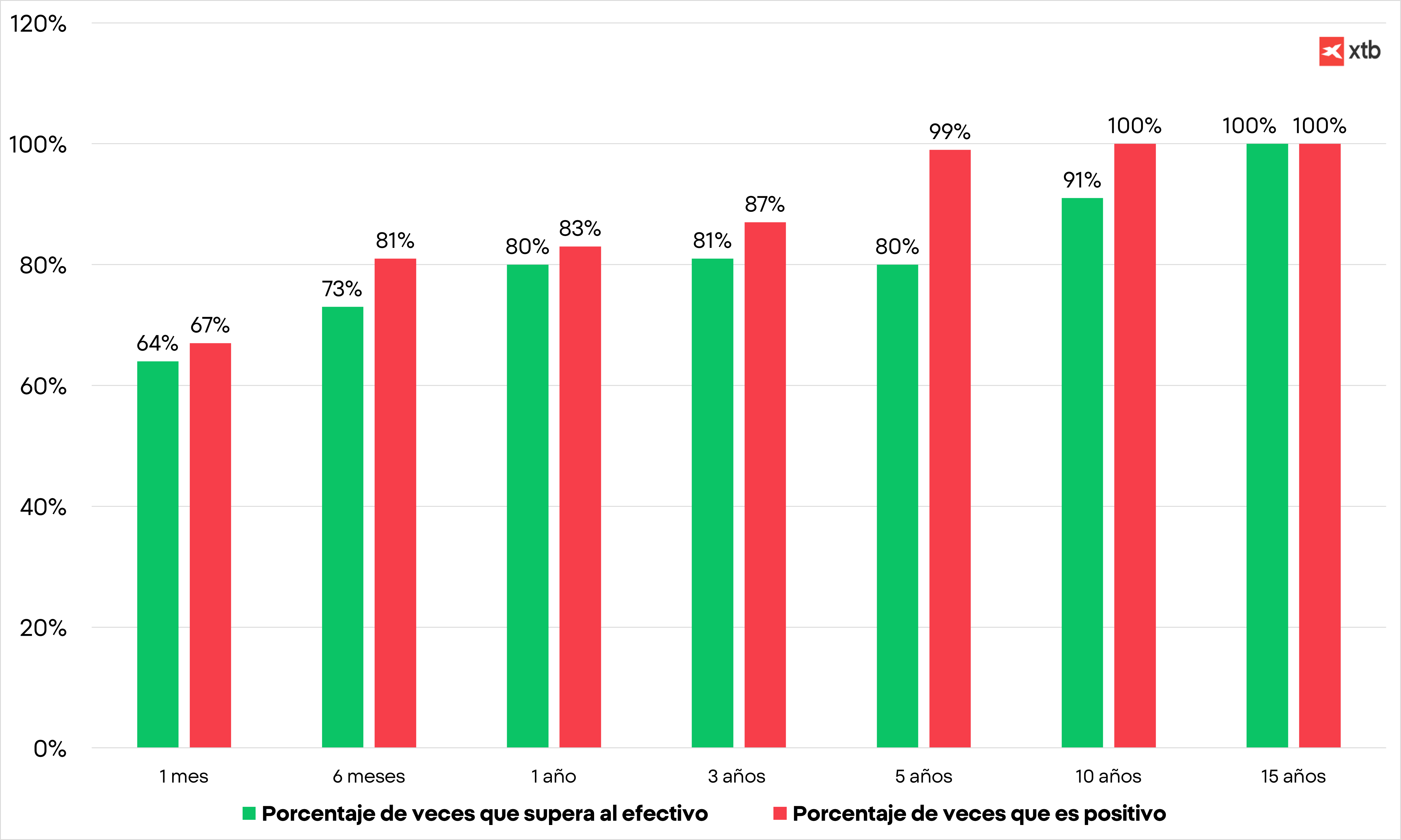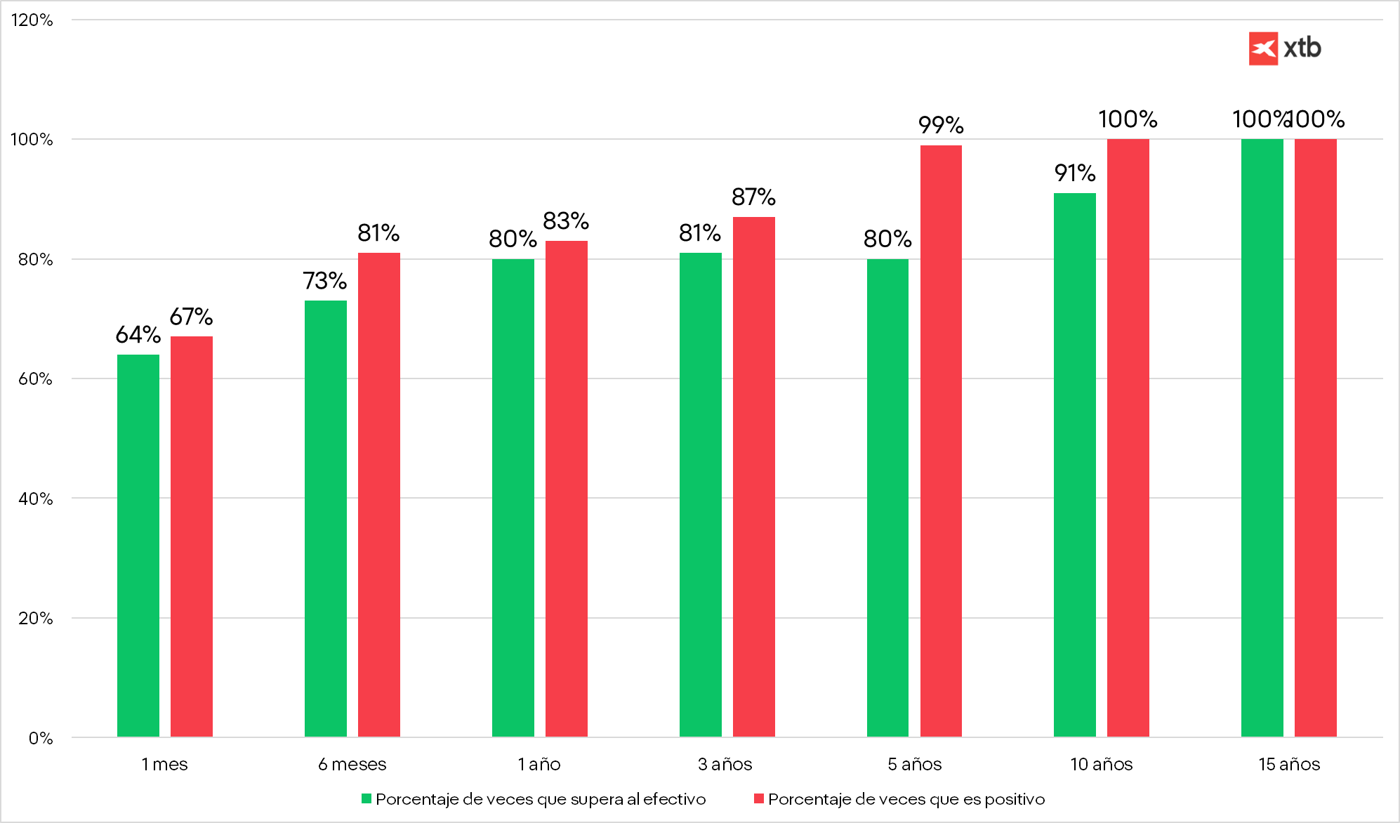 La cartera más típica de todas ellas en los últimos años ha sido la 60% en acciones y 40% en bonos, y sus resultados en los últimos años se ha quedado a mitad de camino entre acciones y bonos, aunque con menor volatilidad. Además, este tipo de cartera ha demostrado con los años grandes resultados, y se ha perfilado como una de las mejores alternativas al efectivo. De hecho, el porcentaje de veces que la cartera 60% bolsa/40% bonos ha generado un comportamiento positivo, mejorando el efectivo es prácticamenete del 100%. Además este año estamos viendo el segundo mejor comportamiento de este tipo de cartera desde el año 2009.