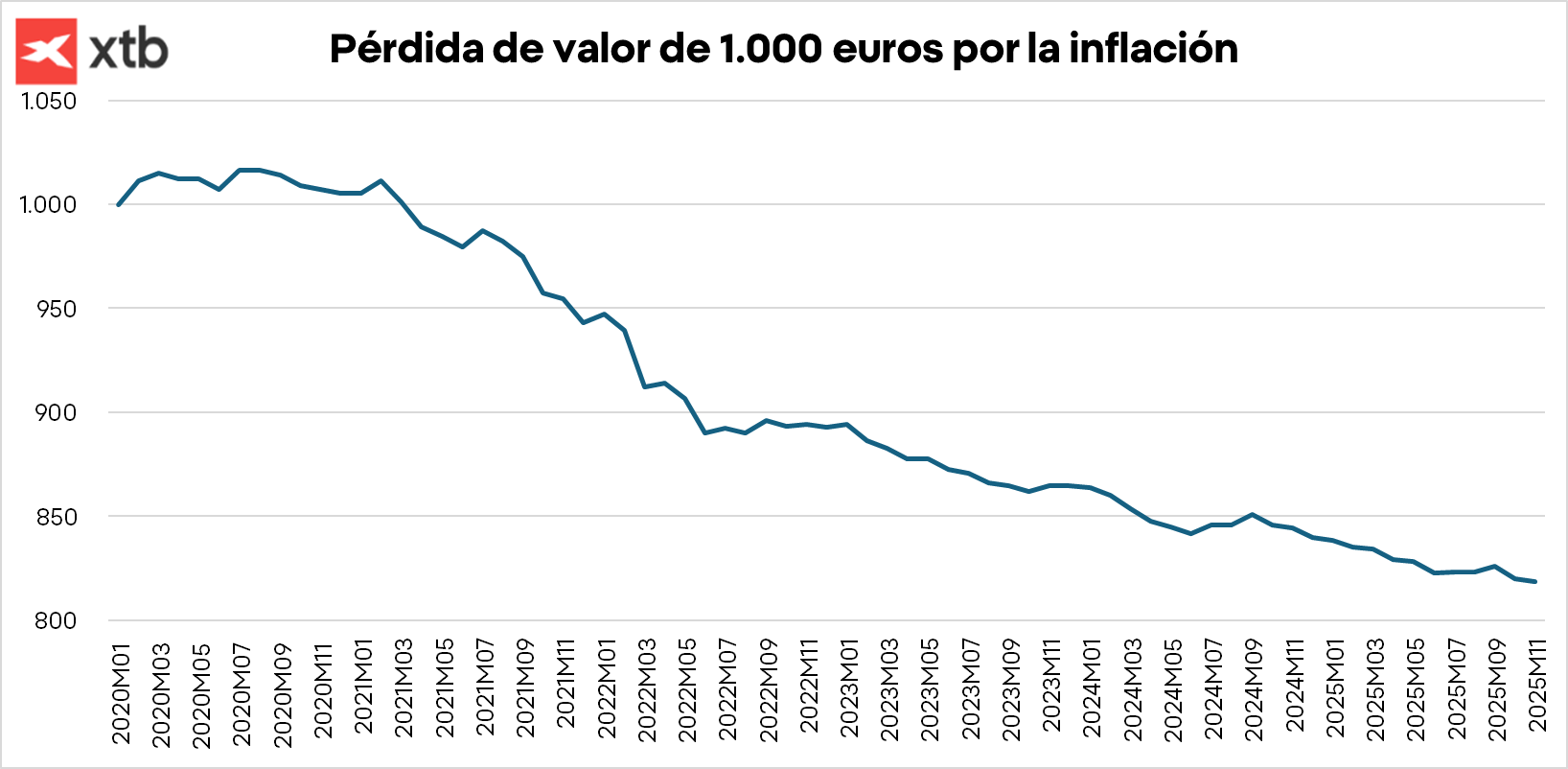 Si miramos desde el año 2020, el efecto acumulado de la subida de precios es claro: lo que antes podíamos comprar con 1.000 euros, hoy tiene un poder adquisitivo real de unos 818 euros, es decir una pérdida de casi el 20%. Nadie nos quita ese dinero, simplemente vale menos.