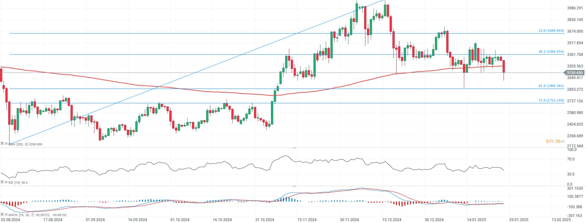 Hoy, Ethereum cayó por debajo de un nivel de soporte clave, en forma de la media EMA200 (línea roja), en 3000 USD. La falta de fuerza para superar los 3200 podría indicar una reversión más permanente a una tendencia bajista.