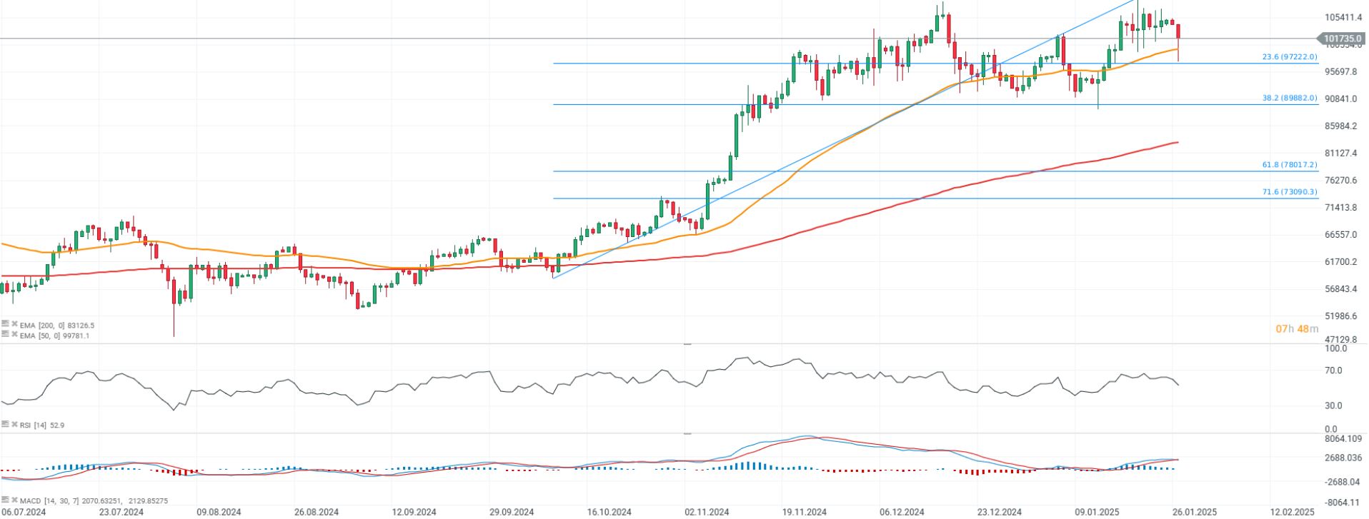 Bitcoin se ha recuperado del retroceso de Fibonacci de 23,6 de la onda ascendente de octubre de 2024 en alrededor de 100.000 dólares.