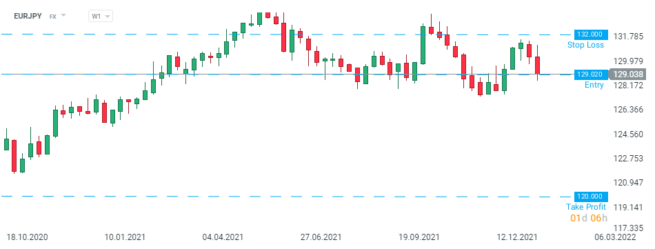 DANSKE recommends taking a short position on EURJPY at 129.02 with a target of 120.00 and a stop loss order placed at 132.00. Source: xStation5