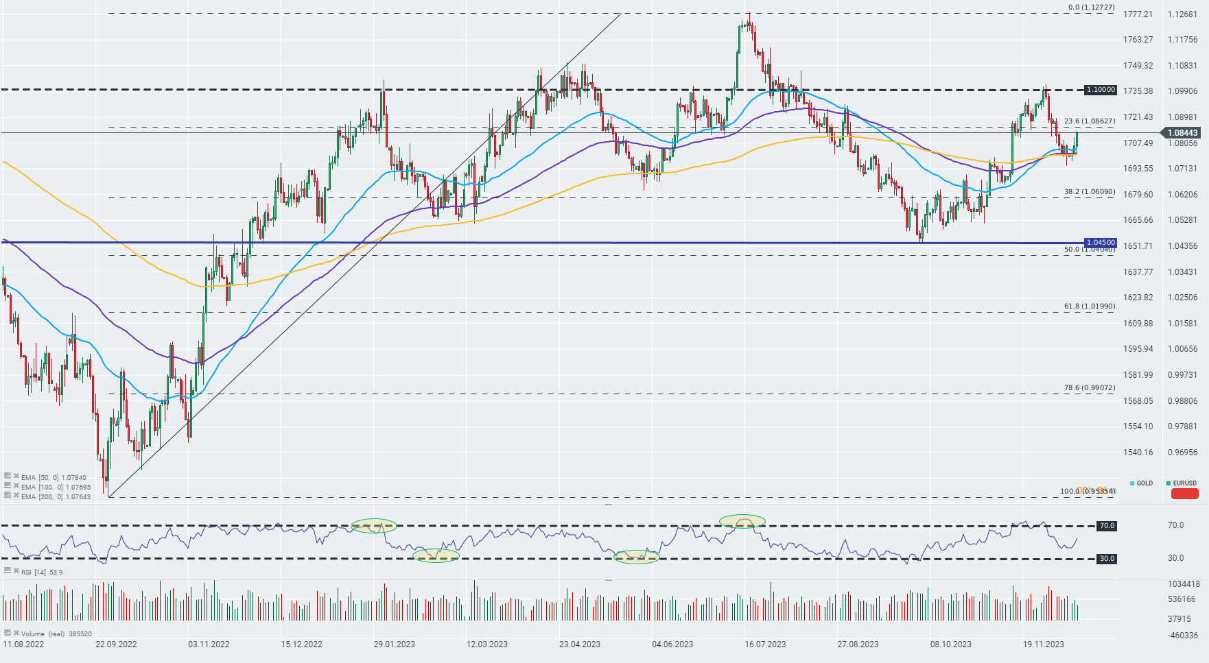En respuesta a la decisión y a las proyecciones de tipos de interés para 2024 y 2025, el dólar baja su valor significativamente. Hoy, la volatilidad antes de la decisión era excepcionalmente baja y el dólar no hizo ningún movimiento brusco. La alta volatilidad volvió al dólar al momento de esta publicación. El Eurodólar sube un 0,40% y borra ligeramente el movimiento inicial hasta alrededor de 1,0850. Sin embargo, observamos una reacción significativa en el curso en los niveles de 1,0800, que también extiende los beneficios de ayer desde los niveles de la línea de soporte en 1,075.