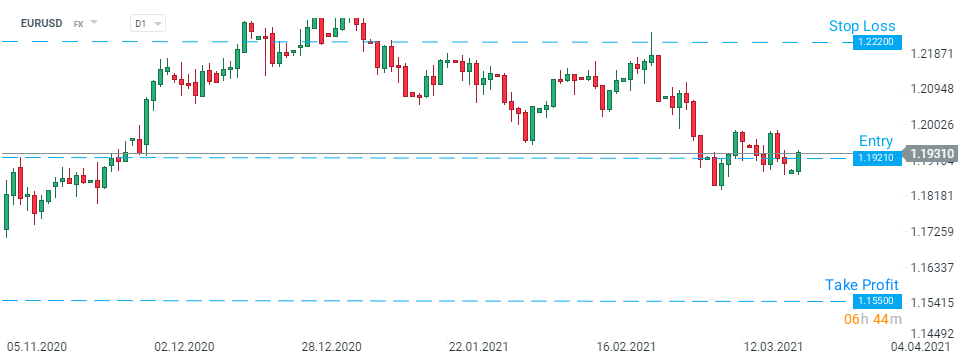 Nordea recomienda tomar una posición corta en EURUSD en 1.1921 con un objetivo de 1.1550 y una orden de stop loss colocada en 1.2220. Fuente: xStation5