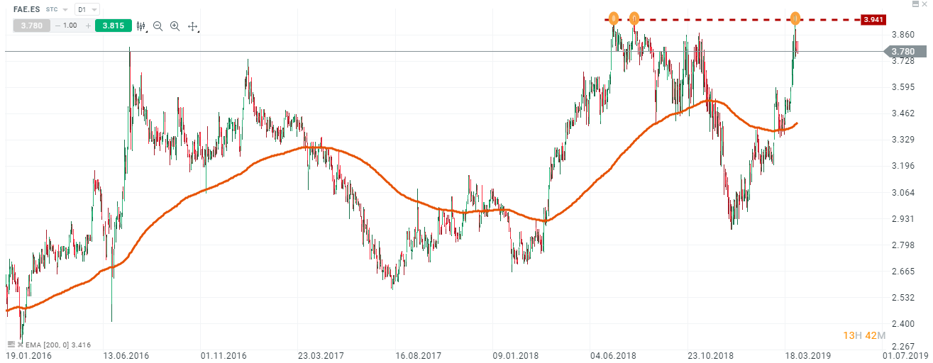 Técnicamente, el titulo formó un suelo en los 2,87 euros por acción tras la corrección que sufrió el titulo en el ultimo tramo del 2018. Actualmente el la acción dibuja una clara tendencia alcista con una estructura de máximos y mínimos crecientes consolidando la zona de máximos de 2018.