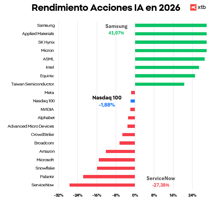 La gráfica muestra el rendimiento de las principales compañías vinculadas a la inteligencia artificial en 2026, permitiendo identificar de un vistazo qué subsectores están liderando el crecimiento y cuáles están sufriendo más en el actual ciclo tecnológico.