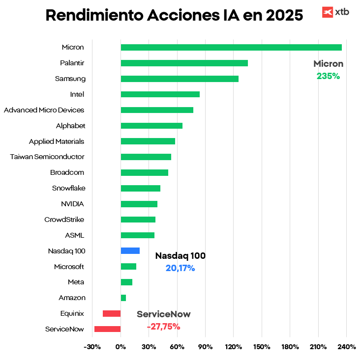 - Como referencia, el Nasdaq 100 avanzó un 20,17%, lo que permite ver cómo gran parte del sector de IA superó ampliamente al mercado.