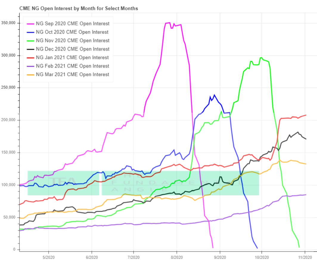 Como se puede ver, el número de posiciones de gas abiertas en los contratos de diciembre o enero es relativamente bajo en comparación con meses anteriores. Fuente: Twitter @BrynneKKelly
