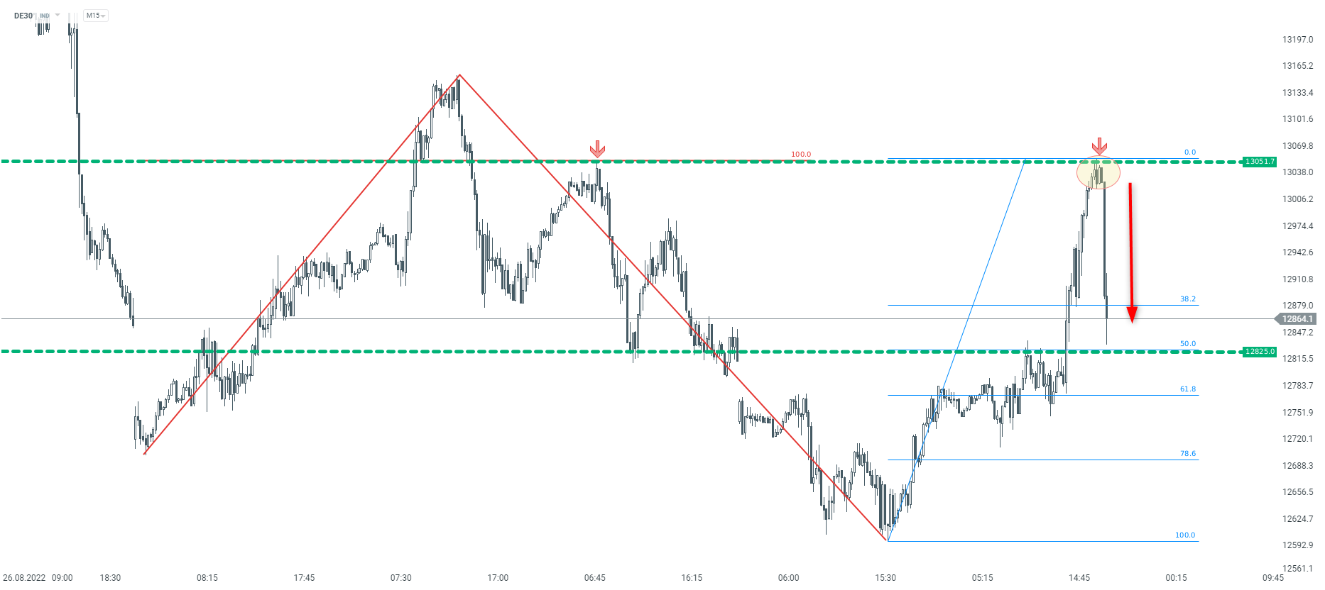 La reacción en el índice alemán DE30 fue instantánea. Momentos antes de que surgiera la noticia del parón, la acción probó una resistencia clave en los 13051 puntos, resultado de la igualdad con la corrección alcista anterior. Posteriormente, el índice se hundió 200 puntos, y actualmente el precio se acerca al soporte en 12825 puntos, que es el resultado de reacciones de precios anteriores y la medida de Fibonacci del 50%.