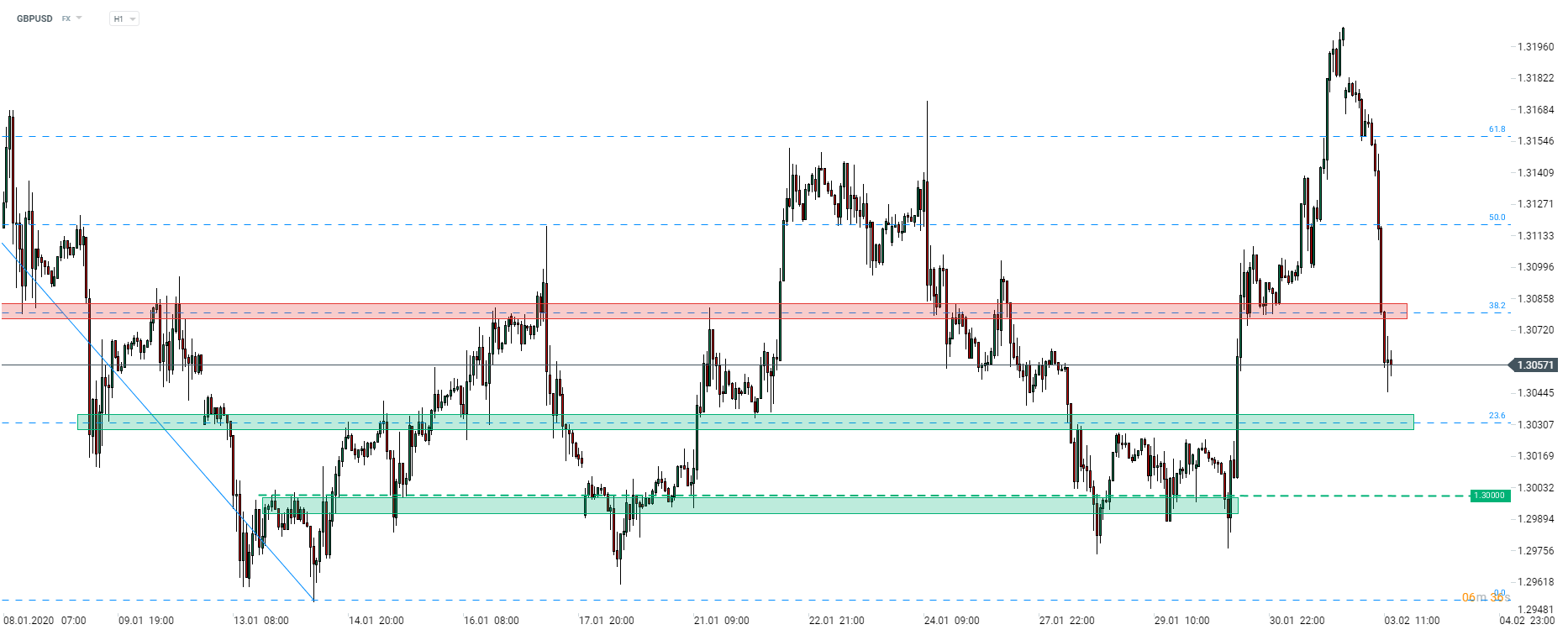 GBPUSD borra las ganancias del viernes y cae por debajo de 1.3100. Fuente: xStation5