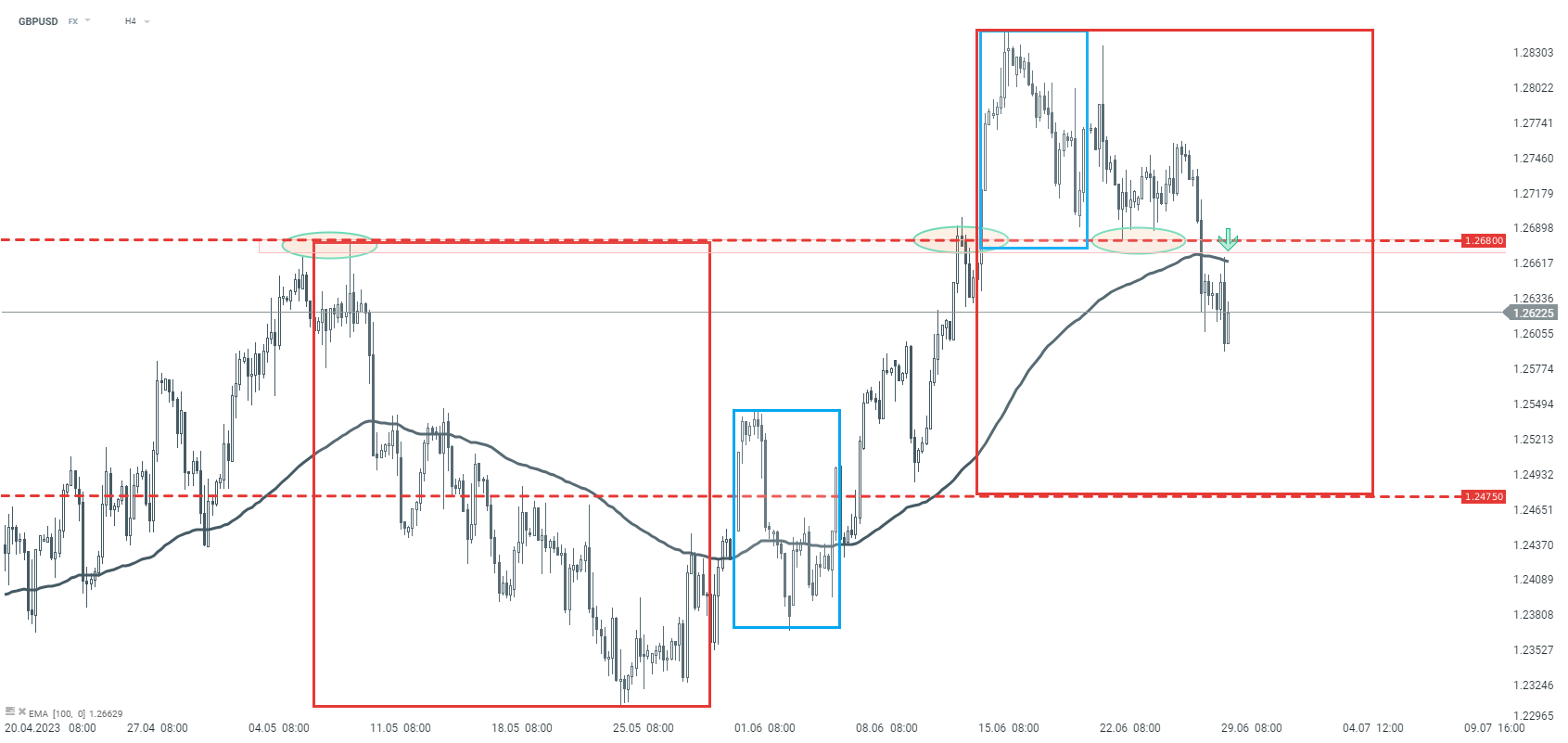 Las cotizaciones del par de divisas GBPUSD han estado recientemente en una tendencia alcista. Sin embargo, al observar el intervalo H4, se observa un posible cambio en la tendencia. El precio retrocedió por debajo de la importante zona horizontal en 1.2680, resultado de reacciones de precios anteriores, la media móvil exponencial de 100 períodos y el límite inferior del sistema local 1:1 (rectángulos azules). Hoy, este nivel ha sido probado desde abajo y el precio se mantiene por debajo, lo que podría indicar una profundización del descenso. Si el sentimiento negativo continúa, no se descarta un movimiento hacia los 1.2475, donde se encuentra el próximo soporte clave de la amplia geometría 1:1 (rectángulos rojos).