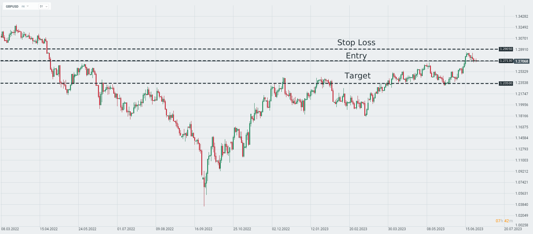 Credit Agricole CIB Research recomienda tomar una posición corta en GBPUSD al precio de mercado con un precio objetivo en 1,2335 $ y una orden de stop loss establecida en 1,2905 $. Fuente: xStation5
