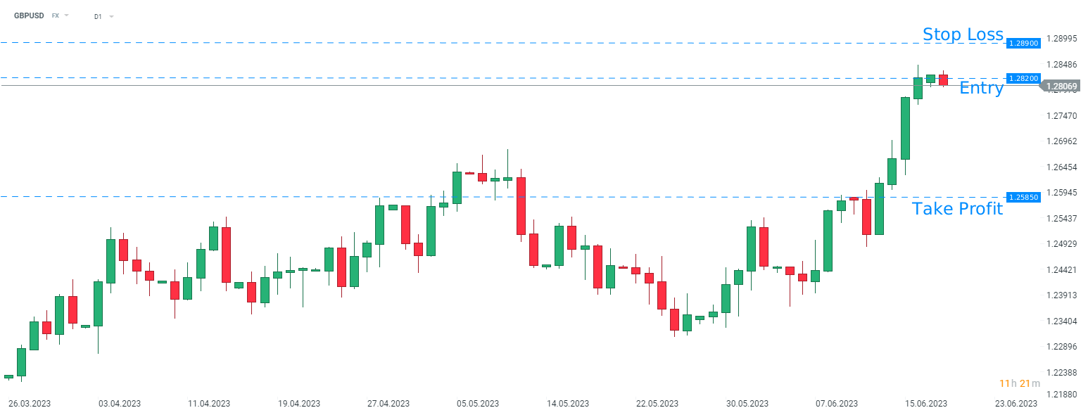 IFR recomienda tomar una posición corta en GBPUSD a precio de mercado con un objetivo de 1.2585 y una orden de stop loss colocada en 1.2890. Fuente: xStation5