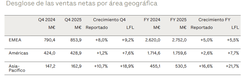 Por geografías, Puig ha conseguido reportar crecimiento en todas sus áreas, con EMEA repuntando en el último trimestre y APAC con un gran desempeño. Vemos muy positivamente el repunte de EMEA en el 4T2025, lo que refleja que su principal mercado sigue teniendo apetito de productos de belleza a pesar de la incertidumbre global.