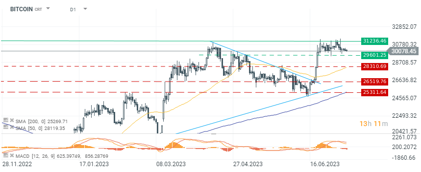 Bitcoin actualmente tiene un precio de 30.100 $, con una ligera pérdida del 0,2% en la actualidad. Se ha ido consolidando por encima del importante nivel psicológico de 30.000 $, pero ha encontrado resistencia al intentar superar los 31.000 $. La prueba repetida del nivel de 30.000 $ plantea la posibilidad de una ruptura en el futuro.