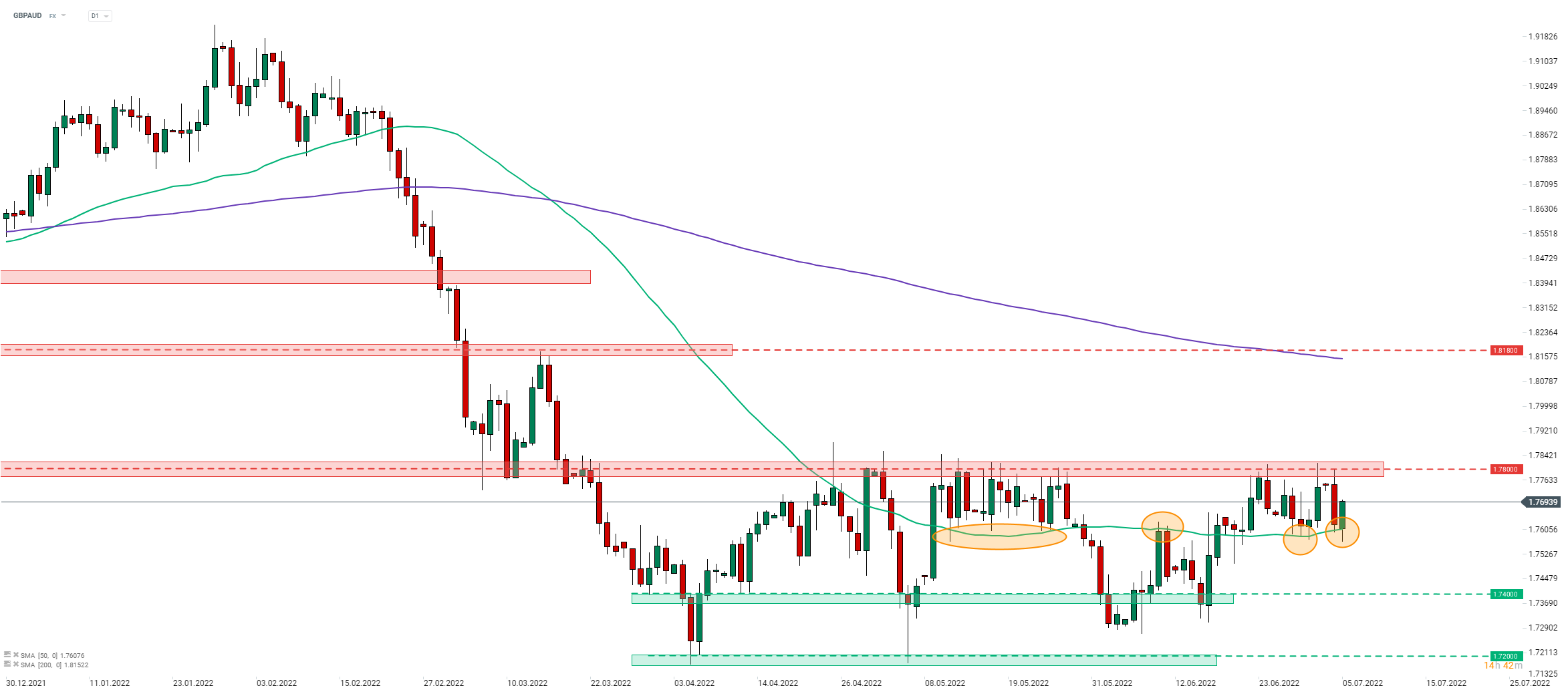 El AUD apenas experimentó alguna reacción a la decisión del RBA, ya que se esperaba y descontaba un aumento de la tasa de 50 pb. El dólar australiano perdió después algo de terreno y ahora es una de las monedas del G10 con peor desempeño. Echando un vistazo a GBPAUD en el intervalo D1, podemos ver que el par intentó romper por debajo del promedio móvil de 50 sesiones (línea verde) el día de hoy. Sin embargo, los bajistas no lograron empujar al par por debajo y se lanzó un movimiento de recuperación. Tenga en cuenta que este promedio móvil ya ha servido como punto de inflexión varias veces (círculos naranjas). Si continúa el movimiento de recuperación, una zona de resistencia en el área de 1.78 será el primer objetivo para los compradores. El par puede experimentar cierta volatilidad elevada después de las 10:30 a. m. BST, ya que se espera que el BoE publique un informe de estabilidad financiera y los comentarios del gobernador del BoE, Bailey, seguirán a las 11:00 a. m. BST.